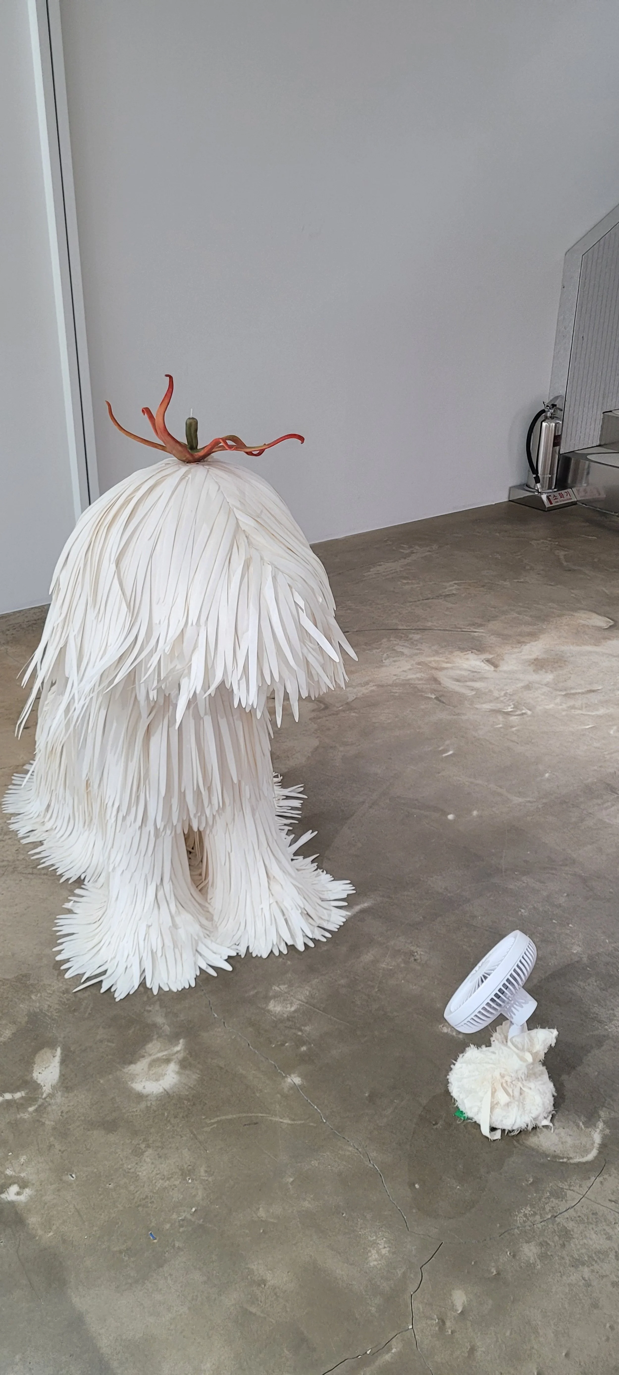 Just next to it we have these huge puppy sculptures with their fur made of traditional Korean mulberry paper, Hanji, their heads topped with wax objects bringing to mind the calyxes (smart word I just looked up – the little ‘hat’-like bits that connect the fruit/vegetable to the stem of the plant) of the pumpkins dowstairs.