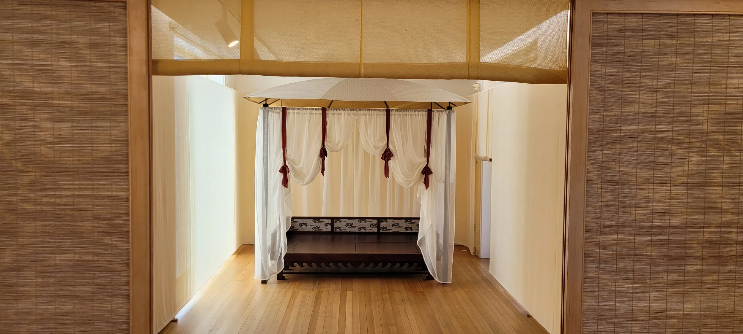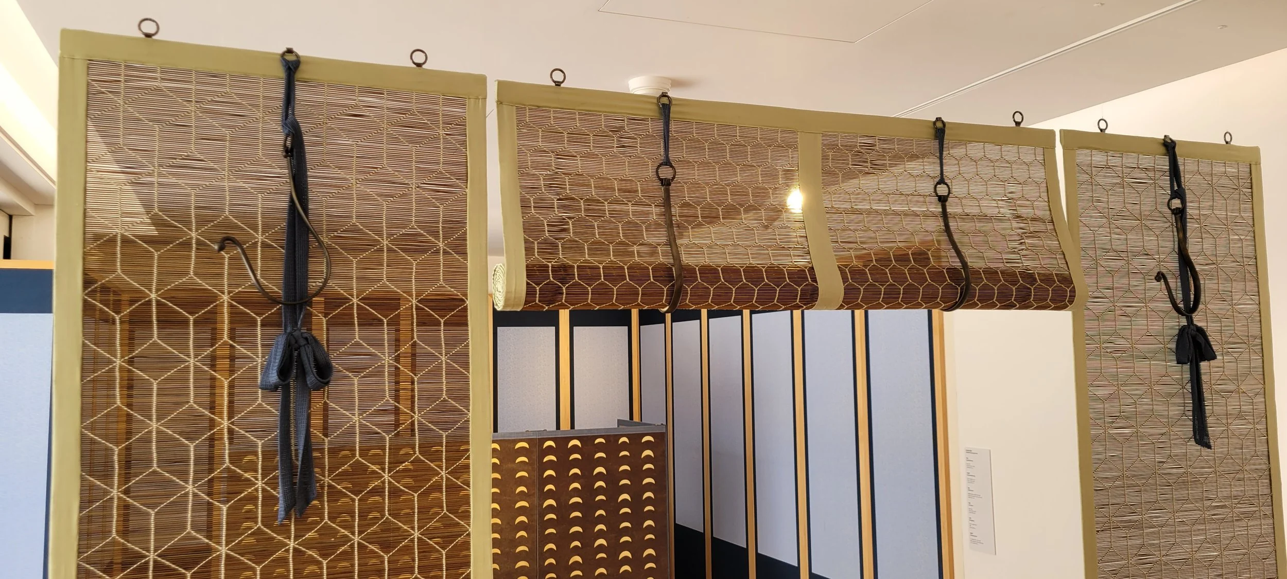 A view of Chwiryeom, a blind woven from strips of blue bamboo, and Byeokbyeong , a wall folding screen, with a crescent moon pattern