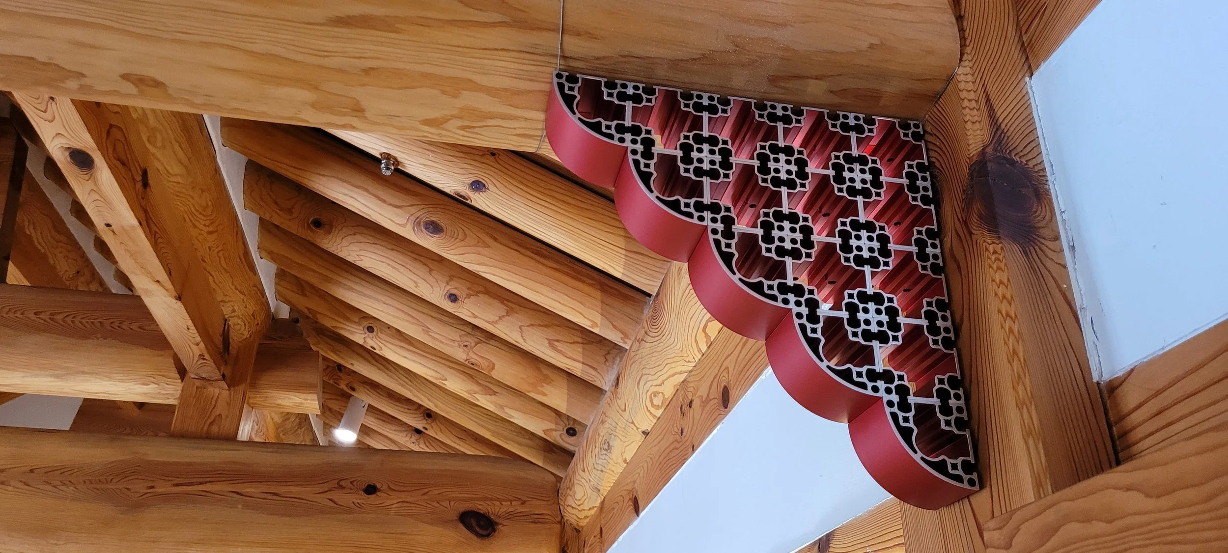 Geometric Boaji by Oneseo Choi (the element supporting the wooden beams, reinterpreted by the artist in aluminum)