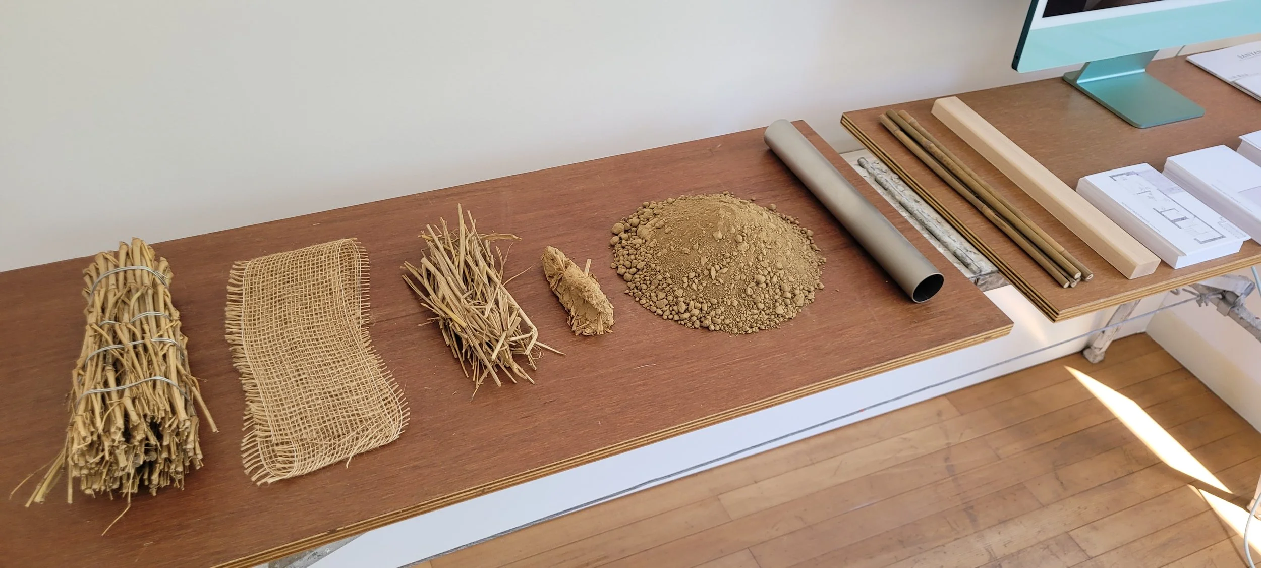 A table showcasing materials used by artist Heechan Park to build the clay wall