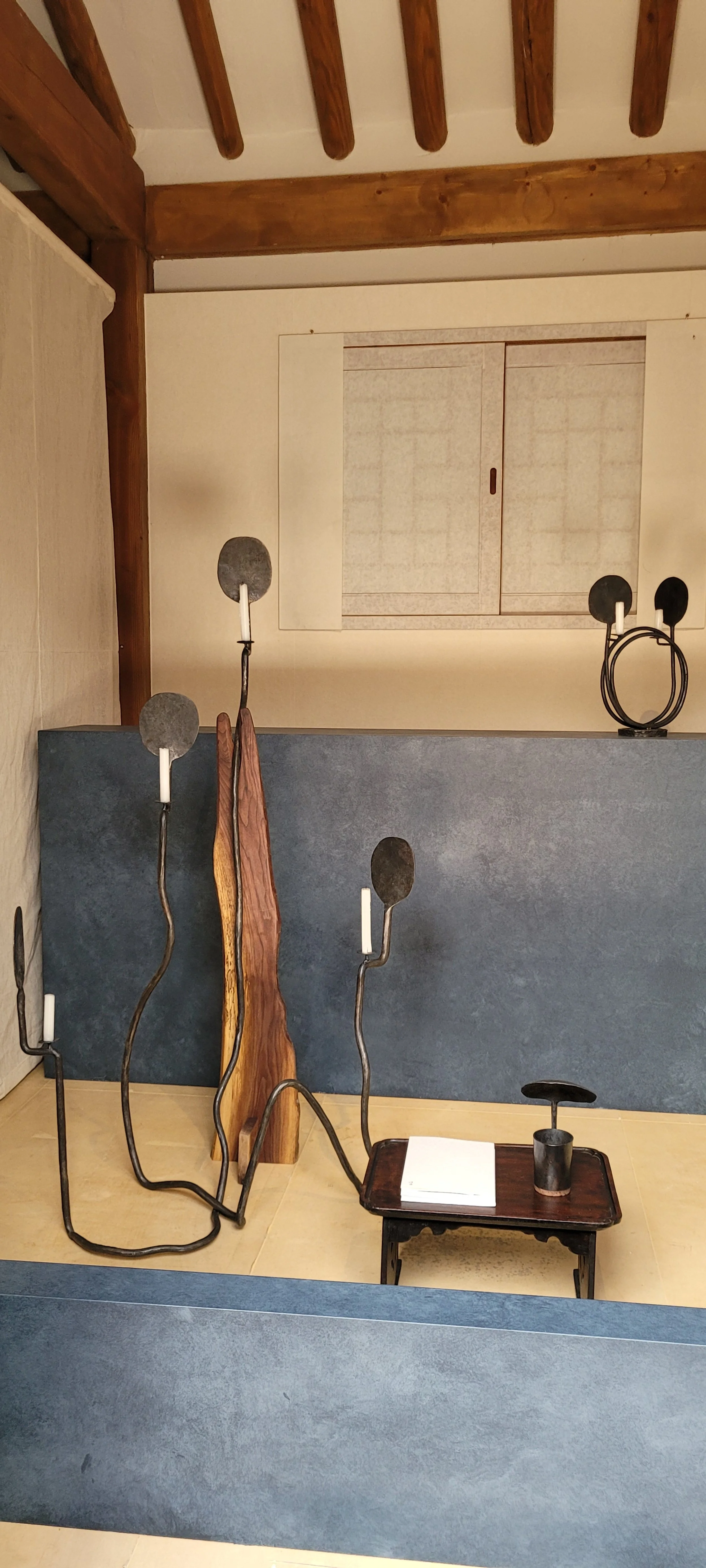 The remaining space is dedicated to the works of Hyeong Goo Jeong, blacksmith, who learned the art from his father- and mother-in-law. After the passing of his father-in-law, to ensure he was able to meet the high standards of the mastery customers became accustomed to, he traveled across the country to visit renowned blacksmith shops and learn their techniques. As he continued working and adjusting to the changes in market needs, in 2008 he was asked to recreate traditional metalwork for the restoration process of the Namdaemun Gate, which burned down in an arson attack. Working with cultural heritage metalwork inspired him to enroll in the traditional metalwork program at the Korean national university of Cultural Heritage and afterwords became certified as a Cultural heritage repair Technician for metalwork. Now, on top of creating beautiful forms such as those showcased at the exhibition, he also serves as Visiting Professor of Metal Crafts in the Cultural Heritage Repair Technician training program.